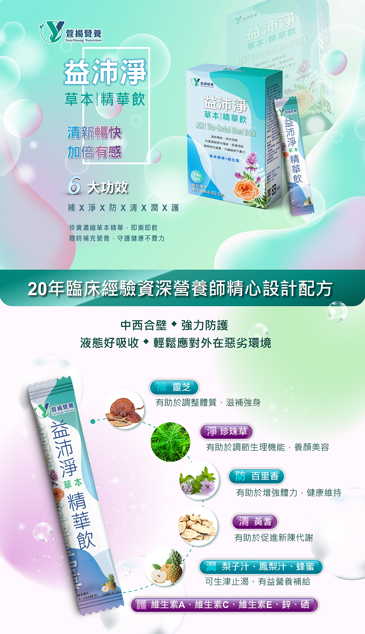 益沛淨草本精華飲係由資深營養師針對有促進新陳代謝需求之民眾,以20年臨床經驗資深營養師根據國內外研究成果為基礎,完整考量營養需求,精心設計之專屬配方。配方採用多項草本精華成份,搭配必要之維生素、礦物質,可有效維持健康,提昇生活品質。